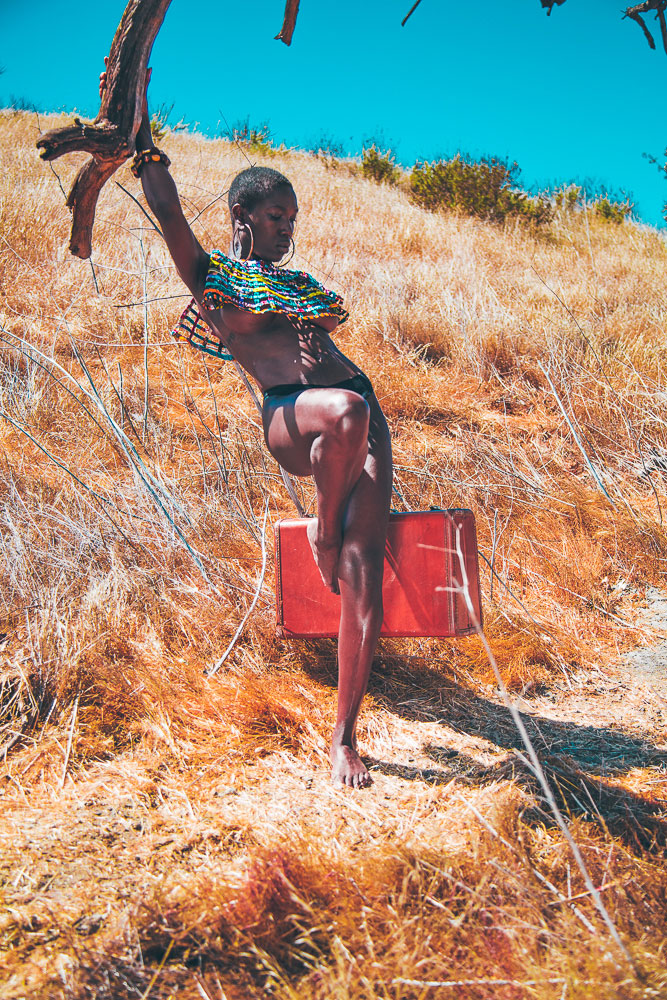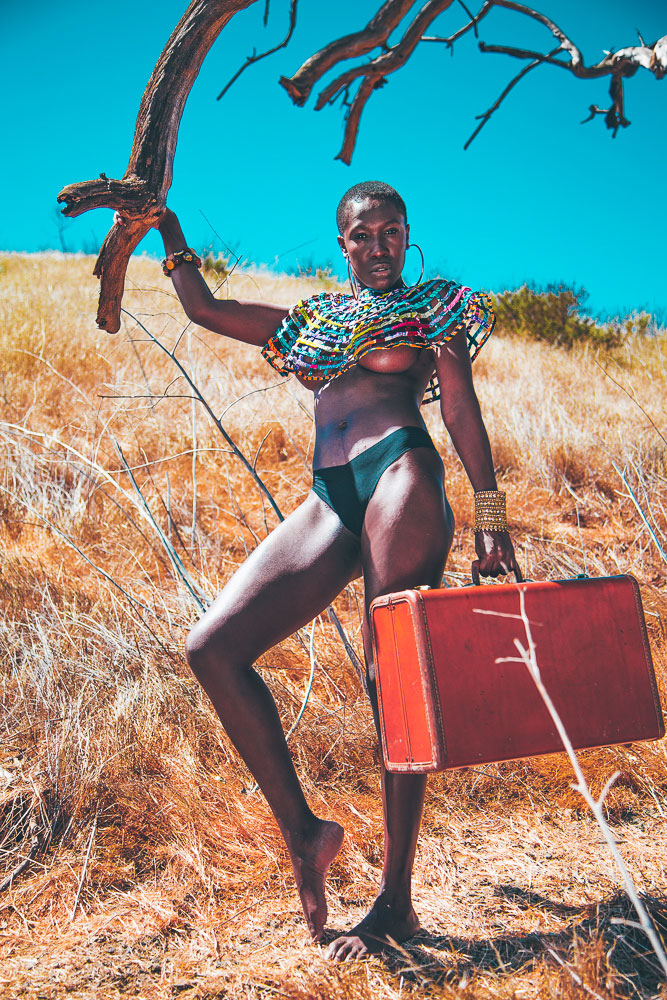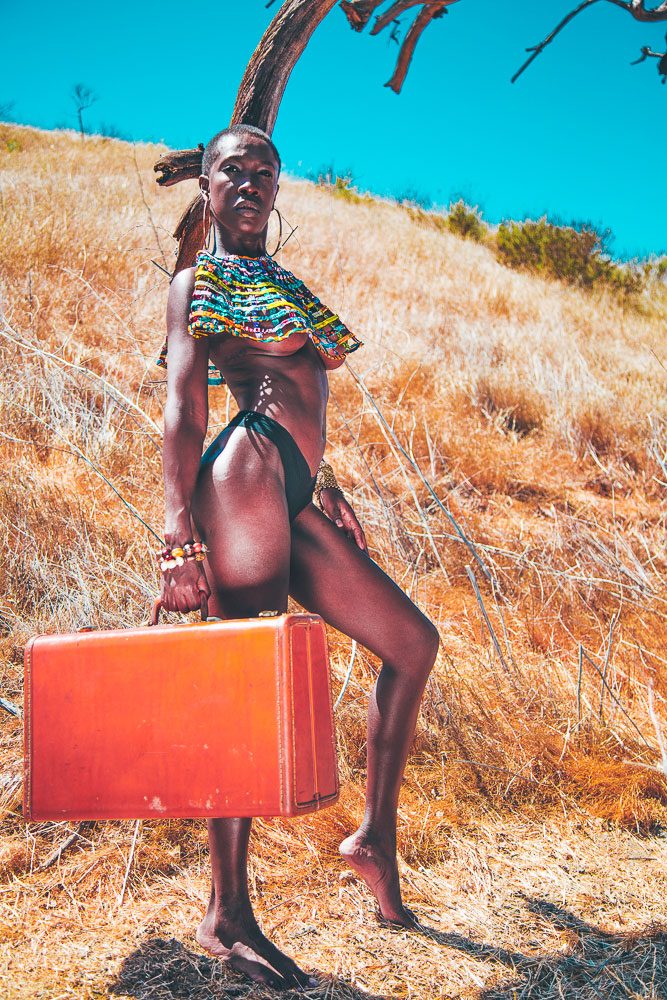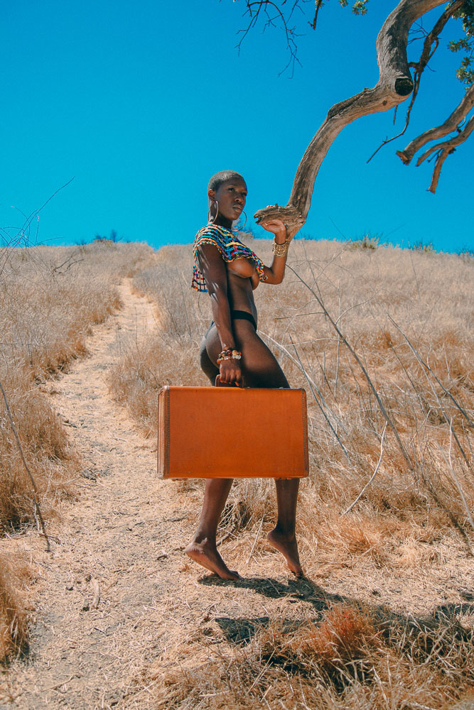 One thing I really love about these images are that the suitcase used was not some random prop, but is an item that once belonged to Tari’s mother. I felt honored she allowed me to capture her with this piece of her life. The trek climbing up this loose, steep hill carrying camera equipment, reflectors and belongings is part of a challenging day i will not soon forget. Before that the march through the empty desert like park was long, sweltering and, rewarding. The images, once all the best angles had been exhausted and the heatstroke moments from our door step, turned out sublime. Embodying the fierceness and poise of the glorious models that came before in the vein of Tyra Banks and Grace Jones; Tari provided the content of my wildest dreams, allowing for my lens, camera and memory card, all working in perfect harmony, to capture the images that future generation would hopefully one day behold and become inspired by. In the end all the blood, sweat and work was worth it and i believe Tari’s Mother would be proud as well!